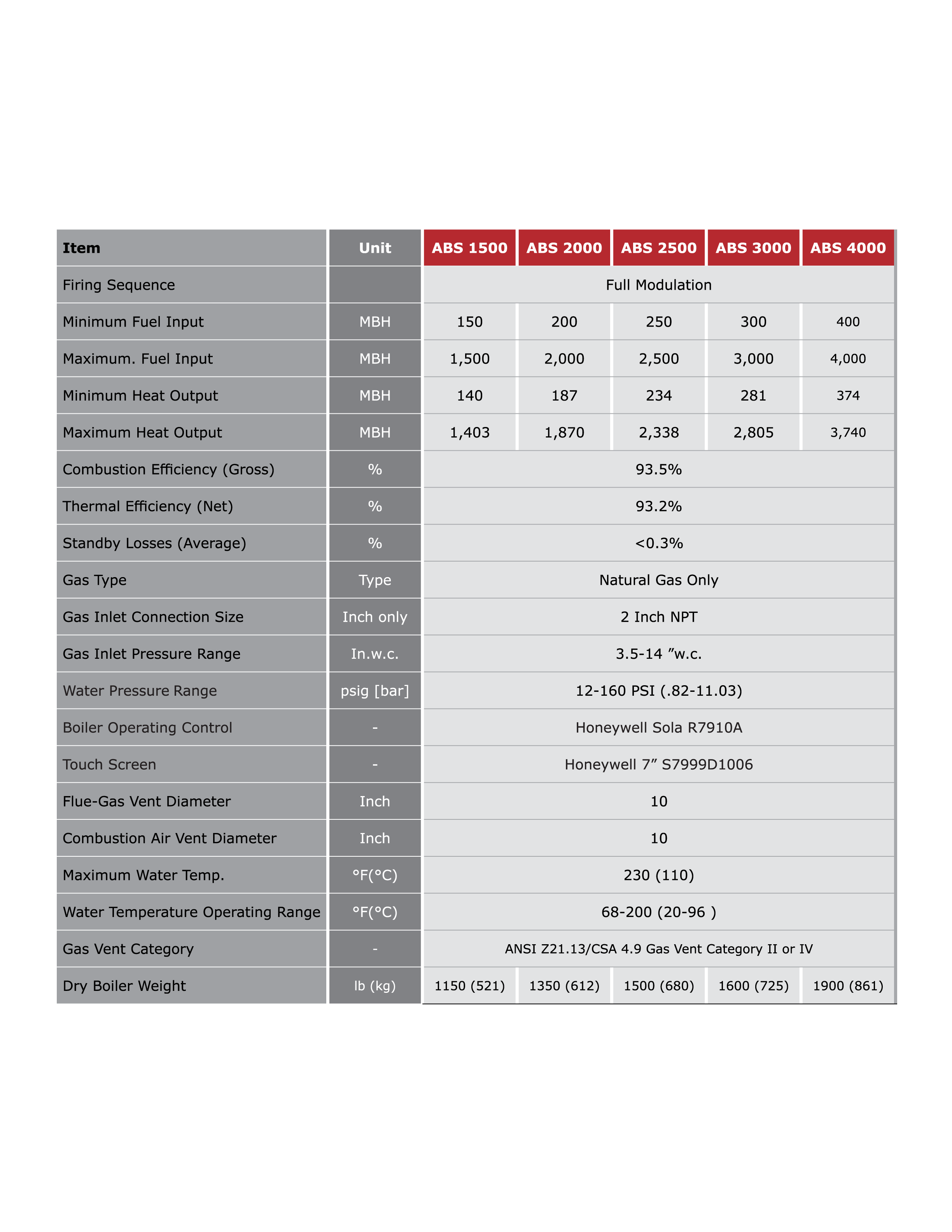 The ABSOLUTE “ABS SERIES” utilizes a durable sectional cast aluminum heat exchanger engineered and designed in Europe. The cast aluminum provides a robust corrosion resistant heat exchanger that allows for ultra-high efficiencies with the added benefit of a small light weight boiler foot print. The ABSOLUTE “ABS SERIES” heat exchanger also provides additional efficiencies with large water ways, reducing the pressure drop through the boiler! We are so confident in our heat exchanger, we provide an industry leading warranty.