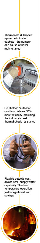 Eutectic Cast Iron boiler body provides exceptional resistance to temperature variations and thermal stress. De Dietrich’s eutectic cast iron is 30% more flexible than any competitive cast iron allowing safe low temperature operation.